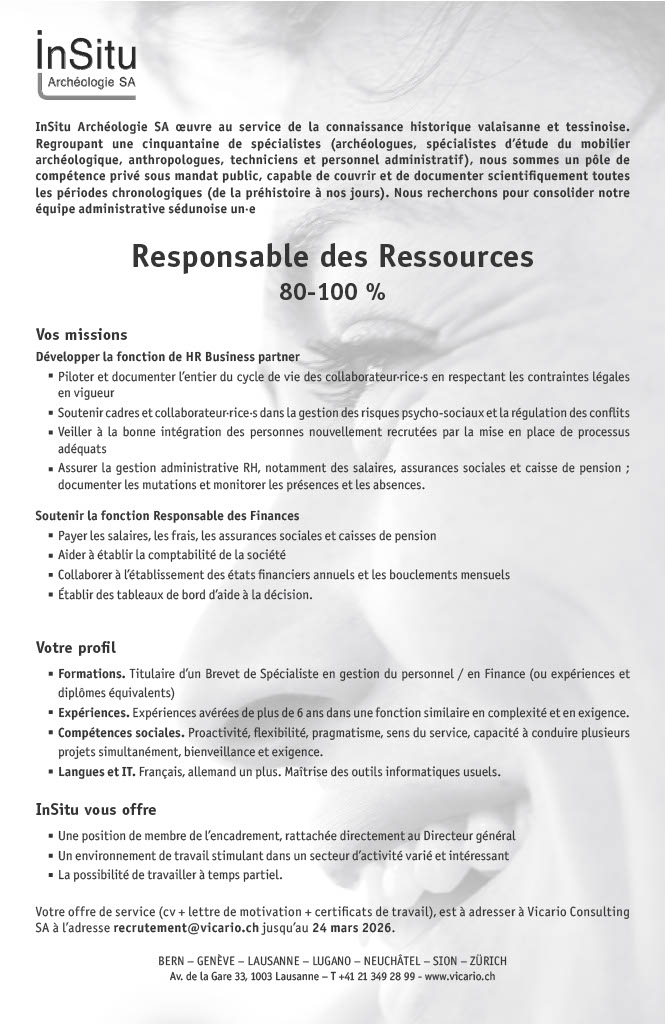 Le bureau InSitu Archéologie recherche un responsable d’opération pour un chantier archéologique en Valais. La fouille concerne plusieurs hameaux médiévaux et modernes, associés à des vestiges agraires diachroniques. Une bonne maîtrise de l’allemand et du français est demandée.